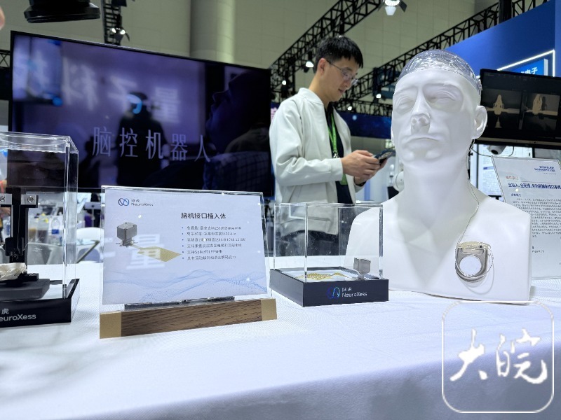 “设备核心部件可完全植入体内,体表没有外露线缆,电池安置在胸部皮下,既能规避发热对大脑的潜在影响,还支持体外充电。”工作人员一边指向展品模型一边讲解。据了解,在大脑皮层植入设备后,就能精准解码运动指令,帮助患者完成取水等基础动作。